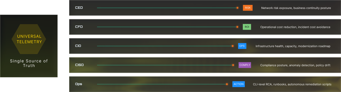 AI-Connected Infrastructure ingests universal telemetry but outputs role-specific answers. It speaks business strategy to the CEO and Python to the Engineer.